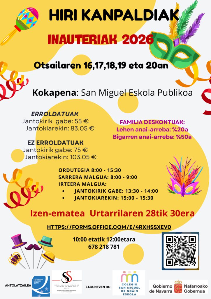 Kanpaldia 3 eta 12 urte bitarteko haurrentzat da eta Noaingo San Miguel Ikastetxe Publikoan egingo da. Egunak: otsailak 16, 17, 18, 19 eta 20.
