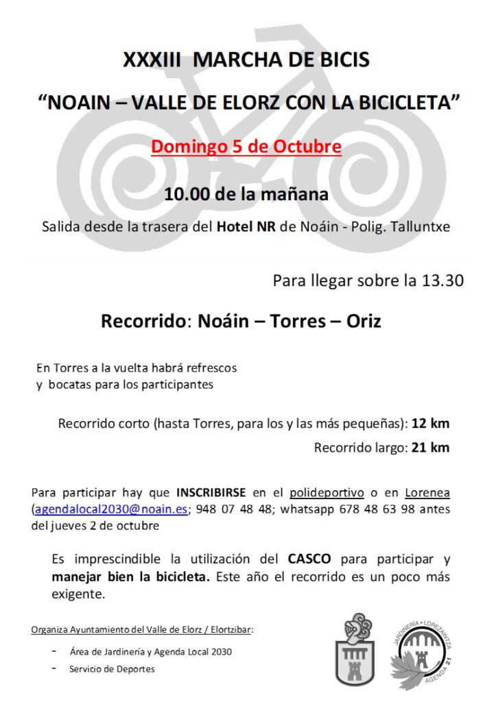 El recorrido saldrá de Noáin a Torres de Elorz hasta Oriz (21,5 km). Habrá un recorrido más corto es hasta Torres (12 km). Este año el recorrido largo es un poquito más exigente porque hay mucho sube y baja, para que lo tengáis en cuenta para los más pequeños. El almuerzo se hará en Torres.